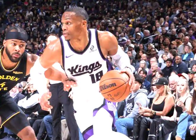 紧接着对阵勇士的比赛,威少又迎来了职业生涯的又一个里程碑。由于拉文缺阵,国王再次变换战术,将威少顶上四号位,德罗赞来到三号位,克利福德打二号位,针对勇士的小球体系,威少与库明加、追梦格林等年轻球员直接对抗。可就是在这样的“错位挑战”中,威少交出了13中9、23分16篮板10助攻的三双数据。比赛里,他不仅多次在后场抢下关键篮板发起反击,还在关键时刻连续给施罗德喂饼,自己命中致命三分;最后时刻面对波杰姆斯基的防守,他更是凭借经验完成抢断,直接锁定胜局。这场比赛过后,威少创造了两项NBA历史纪录:成为联盟首位在7支不同球队都拿到三双的球员,同时也是历史上首个在职业生涯第18个赛季还能砍下20+15+10的控卫。而单场20+15+10的表现,在国王队史近40年里也仅有4人能够做到。