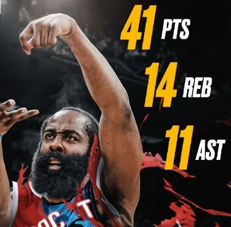 本场比赛哈登出战51分钟,全场25投13中,三分球12投6中,得到41分14篮板和11次助攻!