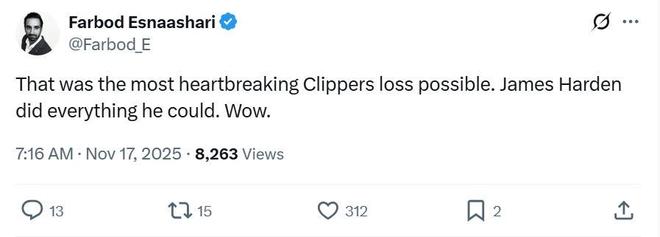 快船队记Farbod Esnaashari则发文到:“这绝对是一场让快船队心碎的比赛,詹姆斯哈登已经燃尽了!真的太遗憾了。”