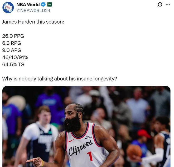 值得一提的是,在持续高产的同时,哈登还保持着88%的生涯出勤率,17个赛季已经出战1163场比赛,美媒NBA World不禁感叹:“为什么没人讨论他不可思议的职业生涯长度?”