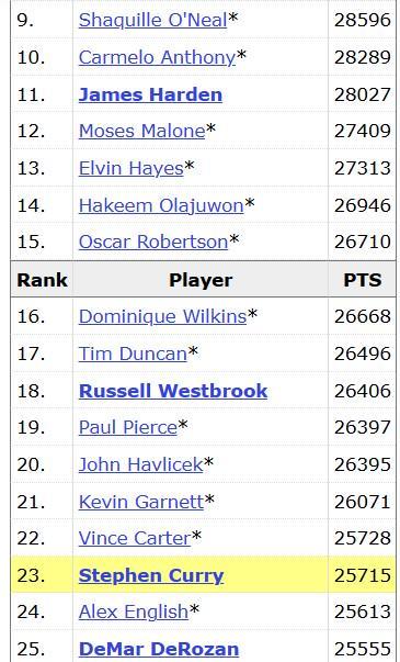 赛前,库里在历史总得分榜上排名第23位,距离上一位的文斯-卡特有13分的差距。经过前两节的比赛,库里已经完成了对卡特的超越,升至历史第22位。在库里身前的是加内特,后者以26071分排名第21位。