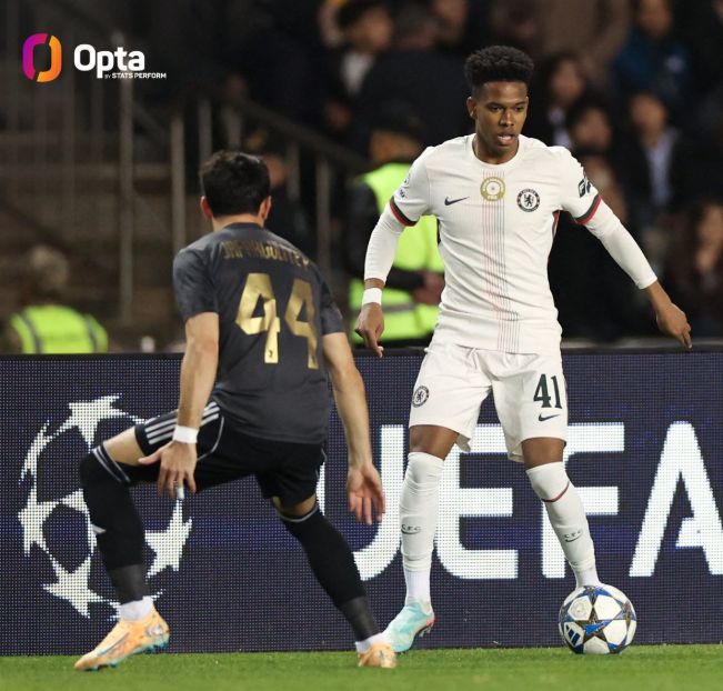下半场刚回来,马雷斯卡立马调整,恩佐、加纳乔、德拉普登场,桑托斯、吉滕斯、乔治都被换下;这次换人的确起到了效果。第52分钟,加纳乔沿着左路突破斜塞被挡后球又回到脚下;阿根廷边锋果断小角度劲射远射扳平比分,2:2!加纳乔也就此成为了首位在未满22岁的情况下就代表两家英格兰俱乐部在欧冠中取得过进球的球员。
